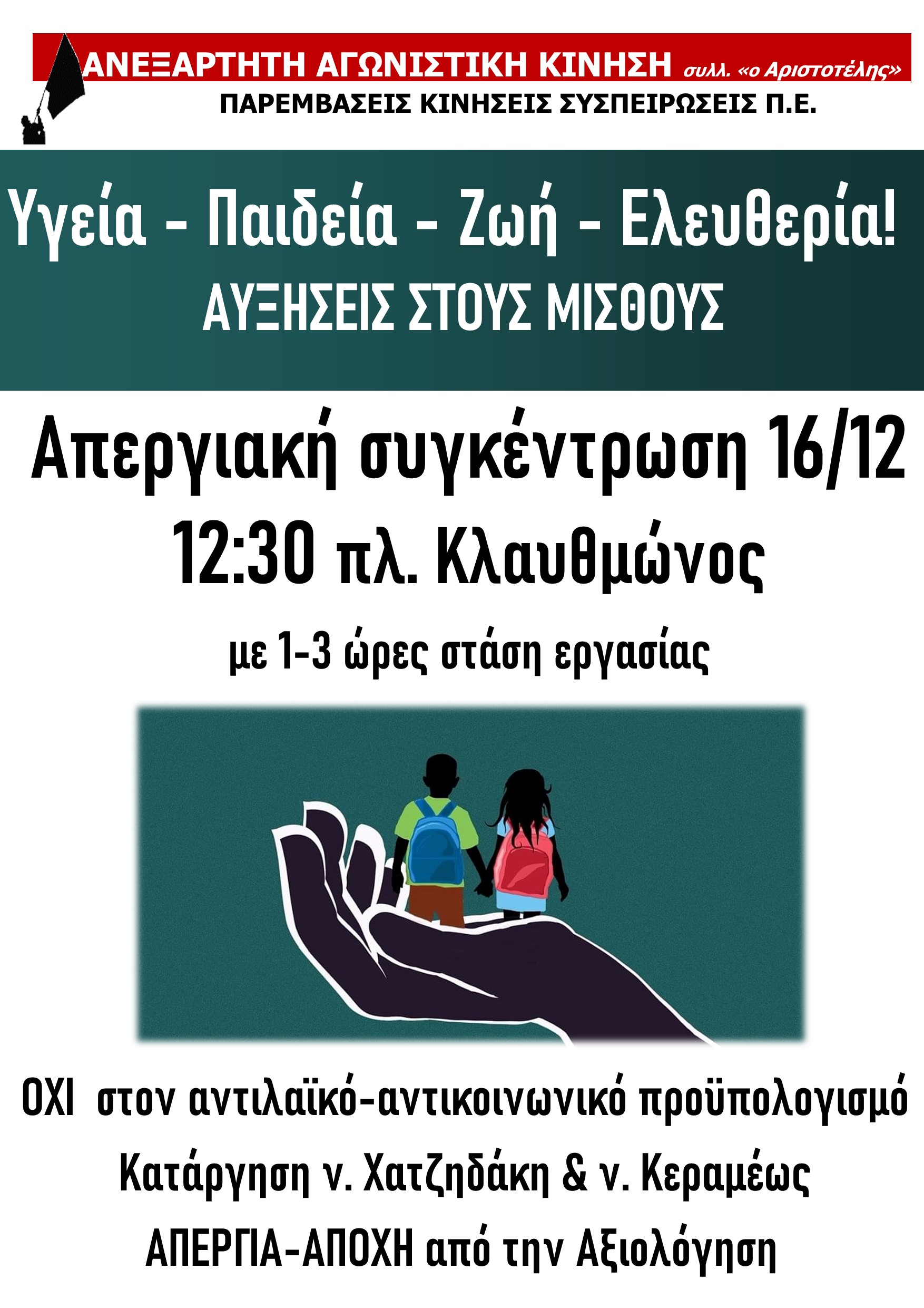 ΠΡΟΫΠΟΛΟΓΙΣΜΟΣ 2022: «Οι φτωχοί φτωχότεροι κι οι πλούσιοι πλουσιότεροι» Υγεία, Παιδεία, Ζωή κι Ελευθερία Αυξήσεις στους μισθούς Να κηρυχτεί 24ωρη απεργία στις 16 Δεκέμβρη Να πάρουν την υπόθεση τα πρωτοβάθμια κηρύσσοντας στάσεις εργασίας και απεργιακή συγκέντρωση Πέμπτη 16/12, 12:30 πλ. Κλαυθμώνος